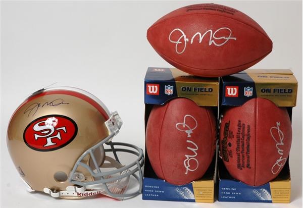 Fine quartet of items signed by one of football's finest, Joe Montana. Full size San Francisco 49ers helmet is autographed in blue Sharpie (10/10). Helmet is Near Mint to Mint, and comes with Steiner cert. Three official NFL footballs are each signed in large silver marker by Montana. The autographs are all Near Mint, with the footballs themselves being Mint.