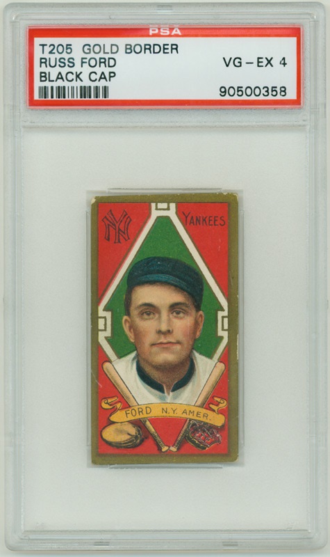 Vibrant red background surrounds portrait of Russ Ford wearing a black cap. Slight corner rounding. Back shows age discoloring, staining and 2 lines of text are worn off approximately mid way up card back.