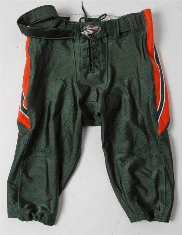 This hunter green with orange and green side striped size 38 Nike pants were issued to a Miami Hurricane player or players in the late 1990's. The accompanying belt is a size 42 and is also in hunter grenn with Hurricanes logo covering metal belt fasteners. "91" is x'd out in black sharpie and "78" is written below it in black sharpie both on inside left waist band.