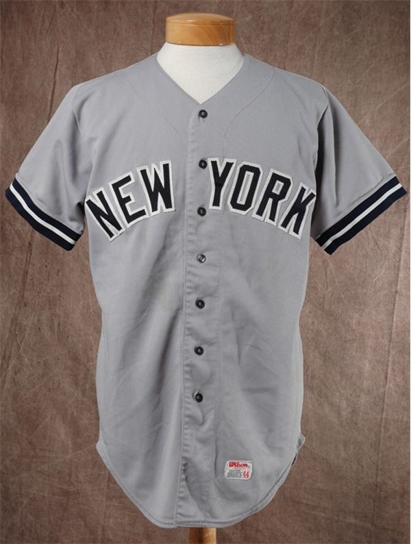Mike Pagliarulo manned the hot corner for 11 major league seasons and is best remembered as the 3rd sacker for The Bombers from 1984-89. This road gray jersey has "New York" across the chest and "6" across the back in royal blue on white tackle twill. Front left tail tagging is "Wilson [size] 44". Back of neck has sewn-in gray label with "Pagliarulo 85 2" chain-stitched in black. Good game use and a small pine tar stain on left arm. The beauty of a Yankee jersey is the unadorned simplicity that defines the essence of the game and the nose to the grindstone attitude of the people who wear the uniform.
