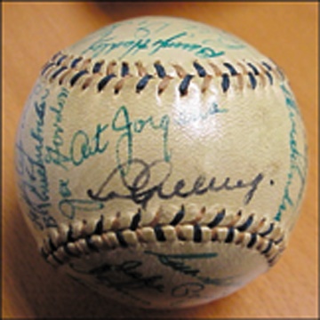 Lou Gehrig's sweet spot signature is 9+/10, and joins twenty-four of his teammates including DiMaggio, Ruffing, Crosetti, Dickey, Gomez, Henrich and more. Secretarial McCarthy. No autograph below 7/10. Non-official ball.