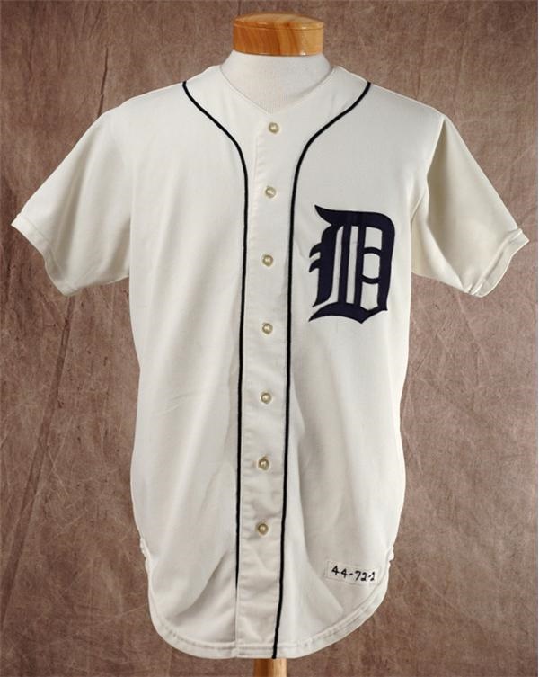 This 1st year knit was worn by Tigers coach Joe Schultz during the 1972 season. Schultz served as a coach on Tigers staff from 1971-76 and managed the team for part of the 1973 season. He was also the manager of the 1969 Seattle Pilots. This home white seven (7) button jersey has the classic Tigers "D" logo in navy on the left breast. Navy trim goes from front jersey bottom around button area and aroung to back collar area. Front tail tag reads "44-72-2" in navy stitching on a white tag. Inside collar tag reads "Wilson 44" with cleaning instructions. Back of jersey has "Schultz" and "51" emboidered in navy.