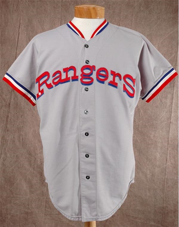 This gray game used jersey has "Rangers" across the chest in red on blue lettering and has seven buttons. Collar and arms are trimmed in red,white and blue stripes. Inside collar tags are: "Wilson 42" with cleaning instructions and "74" stitched in blue on a gray tag. Back of jersey has "48" in red on blue embroidered letters. The name tag was removed and "Criscione" has been sewn in red letters to back of jersey. The jersey was most likely worn in Spring Training by Dave Criscione who went on to have a "cup of coffee" in 1977 with the Orioles.