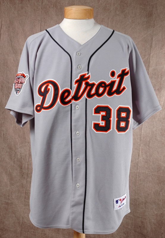 Nice style jersey from this talented righty stuck in Detroit. "BONDERMAN 38" on back, with attractive 2005 All-Star Game patch on the right sleeve. Road Majestic Tigers shirt shows wear, with size 50 tag under manufacturer's tag in tail, and proper "0062" code inside. Obtained from source within Major League baseball.