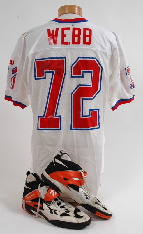 1994 Pro Bowl jersey of Miami Dolphins star offensive lineman Richmond Webb's was made by Wilson and is a size 50. Has Pro Bowl patches on both shoulders, with Spandex sides and is nicely signed on the reverse. Shows little, if any wear, but is a beautiful shirt. The size 15 Reebok turf shoes are very well-worn, and were acquired directly from the seven-time Pro Bowler.