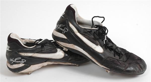 Size 12.5 Nike spikes were worn by The Kid as a member of the Cincinnati Reds and exhibit tremendous wear overall. Embedded red clay on top and bottom of spikes, with his #30 on both heels and the Nike swooshes in marker. Nicely signed in silver on both heels as well. Griffey is climbing the dinger list as we speak, with having just tied Mickey Mantle with career homer #536.