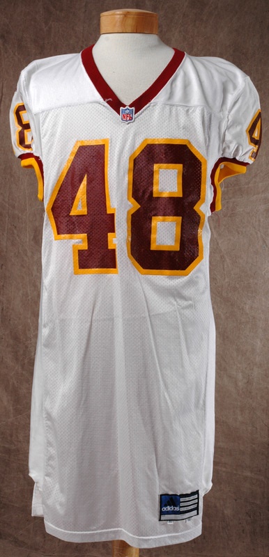 Jersey worn by Stephen Davis during the 2000 season with the Washington Redskins. Adidas jersey has customized cuffs and is a size 46, with "00" year tag present as well. "DAVIS" on plate on reverse. Light use evident, with some pulls on area near neckline, and a few hits marks on numbers as well. Nice shirt from this back with over 7,000 career rushing yards.