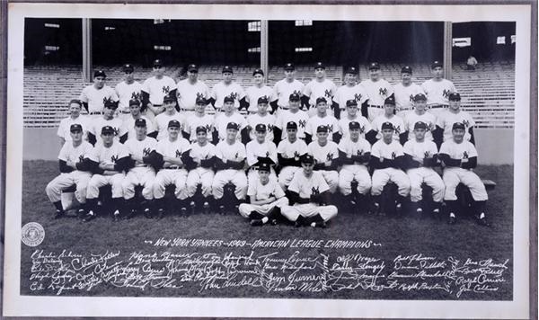 Very vivid photograph of the 1949 New York Yankees proudly posed at The Stadium. Lare format image measures 12x20", and was displayed in a Rhode Island bar for over forty years. All of the Champs are here, including DiMaggio, Stengel, Berra, Mize, Rizzuto, Dickey, Keller, Lopat, Crosetti, Reynolds, Henrich, Bauer, et al. Excellent condition with wonderful patina from having been framed for so many decades.