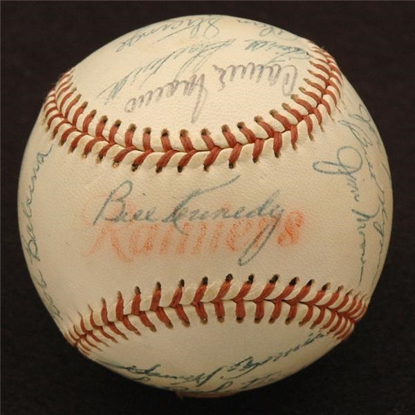 1955 was a great year in Seattle as the Seattle Rainiers captured the PCL crown under Manager Fred Hutchinson. Ball contains twenty-five (25) total signatures including Bill Kennedy, Howie Judson, Vern Stephens, Elmer Singleton and Leo Righetti ( grandfather of future Yankee and current SF Giants Pitching coach Dave Righetti). Fred Hutchinson has penned his name on the sweet spot. Ball is in NRMT condition. Signatures are 9 of 10's and the majority are in blue ball point.