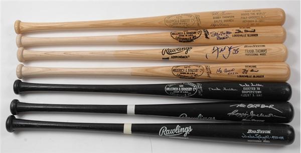 "The Giants win the Pennant" is probably the most famous call in baseball history and this bat collection has a Louisville Slugger (34-3/4") signed by Bobby Thompson and Ralph Branca in blue felt tip. Burnt into the bat is "Shot heard round the world" Polo Grounds-N.Y. October 3, 1951 7 of 51. The other 7 unused bats include a Yogi Berra Louisville Slugger (33-3/4") signed in blue felt tip along with the words “H.O.F. 72,” a Don Mattingly Louisville Slugger Model M110 bat (33-3/4") autographed in blue felt tip, a Duke Snider Louisville Slugger (33-3/4") signed in silver felt tip and imprinted with the words “Elected to Cooperstown August 3, 1980,” a signed Stan "The Man" Musial Louisville Slugger (34"), a Reggie Jackson Rawlings Big Stick (33-1/2"), a Willie Stargell Rawlings Big Stick (33-3/4") signed with “475 HR”, and a Frank Thomas Rawlings Big Stick (33-3/4") signed in blue felt tip.