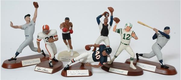 Collection contains sixteen (16) signed figurines. There are seven (7) Salvino figurines: Roy Campanella ( # 962/2000); Jim Brown (# 742/1000); Gale Sayers (#421/1000); Muhammad Ali ( limited to 400 produced); Mickey Mantle (#764/1732); Mickey Mantle (#1101/1732) & Joe Namath (#1073/2500). There are nine (9) Gartlan figurines: Joe DiMaggio "The Yankee Clipper" (# 661/2,214); Hank Aaron "The Hammer" (#193/1,982); Carl Yastrzemski "Yaz" (# 1296/1,989); Yogi Berra " The Catcher" (# 220/2,150); Carlton Fisk "The Commander" (# 315/1,972); Ken Griffey, Jr. "Junior" (#831/1,989); Wayne gretzky "The Great One" (#432/1,851); Brett Hull "The Golden Brett" (#488/1,986) and Bobby Hull "The Golden Jet" (# 488/1,983). All statues are in EX-MT condition. All signatures are real. Statues comes as seen (no boxes).Thirteen (13) of the 16 come with original COA's.