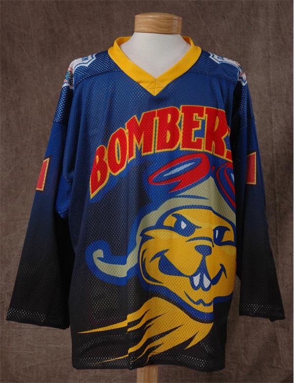 Mega colorful 93-94 game issued ECHL Dayton Bombers jersey #21. May have a game or two in it but we can't say for sure. OT tagging in collar, size XXL with fight strap. WTUE radio sponsor logo on tail. Super hockey sweater from that bone crushing minor league.