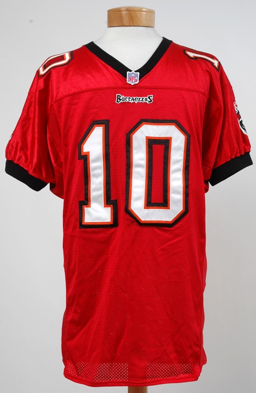 This size 44 Adidas game jersey was worn by Shaun King in 1999 or 2000. The jersey has "Buccaneers" embroidered near neck line in black stitching trimmed in white, an "NFL " patch is sewn directly above it. The number "10" is centered on chest in white on orange on black.Inside tail tag is sewn in and reads : "44" with cleaning instructions.Shoulders have Adidas logo and Buccaneer logo patch ( Pirate ship w/ skull and cross bones and orange football).Back of jersey has name plate with "King" in white and large "10" fills up jersey back in white on orange on black numbering.