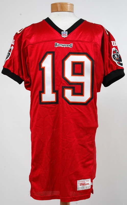 This size 42 Wilson jersey was purchased in a bulk buy of Buccaneer jerseys. It is game ready and name plate has been replaced by team.Front of jersey has "Buccaneers" embroidered near neck line in black stitching trimmed in white, "19" is centered on chest in white on orange on black. lower left tail has a tail tag " Tailored Exclusively for Prestige Teams by Wilson" with cleaning instructions. A small tail tag "42" is attached to "Wilson tag tail. Shoulders have Wilson logo "W" and Buccaneer logo patch ( Pirate ship w/ skull and cross bones and orange football).Back of jersey has name plate with "K. Johnson" in white and large "19" fills up jersey back in white on orange on black numbering. .