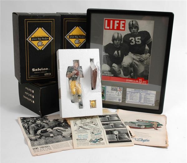 Collectin contains three (3) signed limited edition Salvino statues of Paul Hornung(# 282H/500), Jim Taylor(#282H/500) and Bart Starr( #282H/500). All of the statues come in their original boxes and come complete with COA's. Statues have never been displayed and have been removed for photography purposes. rounding out the collection is a framed signed cachet featuring West Point greats Glenn Davis and Doc Blanchard. Cachet contains 1946 Life Magazine cover, a first day cover signed by Davis and Blanchard in blue sharpie and a 3" x 6 " 50th Anniversary Westpoint Army Cadets Hall of Fame card documenting the their careers. Collection also contains the actaul Life Magazine article of Blanchard and Davis from Sept. 16, 1946 issue.