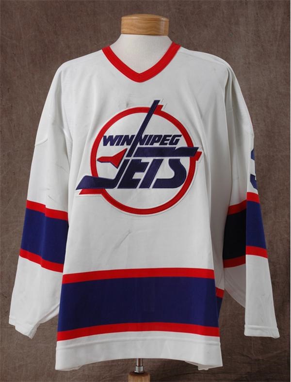Defenseman Brent Thompson wore this jersey during the 1994-95 Jets season. Shows great game use with correct Maska Ultra Fil tagging, size 54. The Jets are no longer, so these sweaters are becoming harder to find. Goals For Kids patch on left shoulder. Get in while they are still reasonably available.