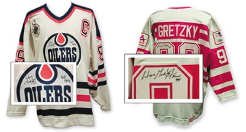 A pair of Upper Deck Authenticated pro-weight jerseys hand signed the greatest player ever to lace 'em up. Firstly, a double CCM Edmonton Oilers uniform, properly number and crested, signed on the front crest and numbered "161/499." A commemorative "The Great One" patch adorns the chest. Secondly, an attractive white and red double CCM uniform from the Wayne Gretzky and Friends Ninety-Nine Tour, identical to the one he wore including NHLPA and Time Warner patches. This one has been signed on the back numbers "Wayne Gretzky, 99, Tour '94" and hand numbered "277/999." Both autographed sweaters come with official Upper Deck Certificates.