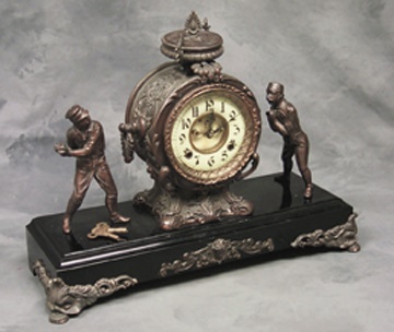 Out of this world mantle clock is the finest quality baseball decorative arts piece ever produced. We have salivated over this for years at the home of Barry Halper. Highly ornate workings are sandwiched by two exuberant baseballers, which each stand a lusty 7.5" high. They perfectly depict pitcher John Montgomery Ward and catcher Buck Ewing of the mighty New York National League Base Ball Club. They stand on a voluptuous 2.5" thick marble base, which aids in giving this piece a quality that is unsurpassed. The mighty clock itself is a thrilling combination of Victorian and early art nouveau stylings. The ivory-like porcelain face exudes sumptuous crafting, with "SF" markings and displays the inner workings of this reliable timepiece. Yes, it even chimes on the hour and half-hour! The base is extraordinarily detailed and supremely elegant. The feet are the heads of fish that grasp pedestals in their mouths. The front of the base is decorated with the head of a woman right out of Greek mythology. The trusty original wind-up keys are included. Put it all together and this is a dream piece. The best of the best. This is the type of piece that you build a room around (20" long x 7" wide x 15" tall). EX-MT. Ex-Barry Halper Collection.