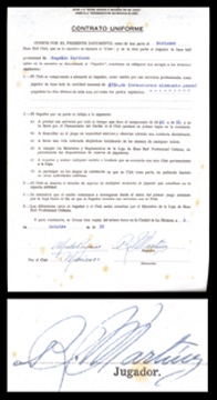 Limonare was more than a ball player to the Cuban people, he was a hero. A big pitcher in the 1940's, he played for the Washington Senators. Signature in Mint ink except for a small brown spot which rests next to it. Contract itself has some brown spots o/w EX.