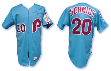 His thirty-six home runs and 106 RBI's led the league in '84 as the burly third baseman creeped ever closer to immortality, but he was wearing this very jersey when he sent number 400 out of the park. Sky blue roadster has zipper-front with "20" and the Phillies "P" on chest and "Schmidt 20" on back. Trademark button in tail. Great patch on left sleeve commemorates the centennial of the team. "Schmidt" stitched into collar and "84 1" stitched in tail. "Wilson [size] 44" tag in tail as well, with "Tapered" flag tag. Strong wear. Finally, the HOF'er has signed in blue sharpie on the upper left chest, "Mike Schmidt #400." Came from a source inside the locker room in Los Angeles where the game was played. He hammered it off of Bob Welch and later signed the jersey for the gentleman who obtained it with honor.