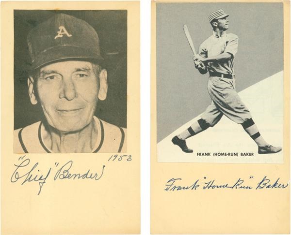 Two more great Jim Davidson government postcards, singly signed by two of Connie Mack’s biggest weapons on the Philadelphia A’s in the early 1900s -- HOFers Frank “Home Run” Baker and pitcher Chief Bender, on cards with their images affixed, Baker from yore and Bender as an elderly A’s coach. Both signatures are 9/10 and both postcards are EX+. The Bender postcard is not postmarked but is marked “1953” in his hand above his signature, meaning he signed a year before his death. The Baker is postmarked February 7, 1955 -- 8 years prior to his death -- from his retirement home in Trappe, MD.