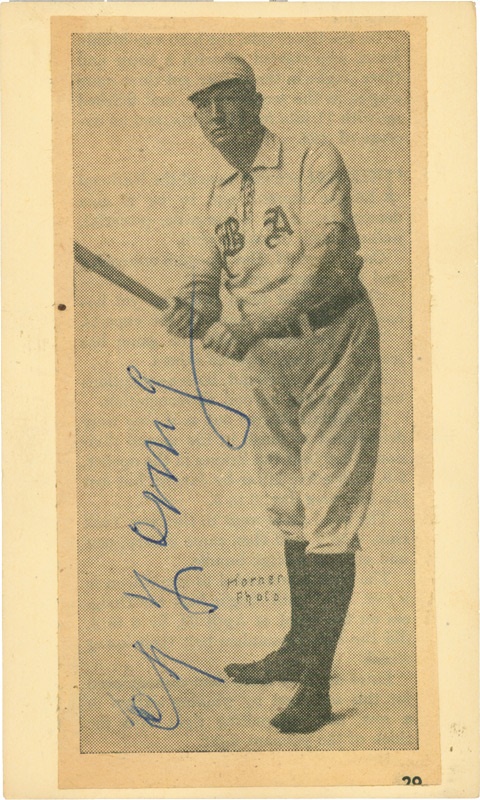 An amazing two-fer for Jim Davidson -- Cy Young’s second signed government postcard, this one postmarked January 20, 1955 from Newcomerstown, OH, just 10 months before his death, and again one of the old master’s last. Young signed on a newspaper photo taken by Carl Horner which was affixed to the postcard and takes up nearly the entire back side. Signature in blue pen is 9/10 while the postcard is EX-MT with mild soiling.