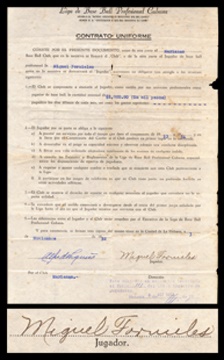 Outstanding group of "major league" contracts all for and signed by the great Cuban stars of the Negro Leagues. All measure 8.5x13", and are signed by the player, team officials and include other important data like their ridiculously low salaries (in pesos). Remember, these would have been the multi-millionaires of today. In U.S. dollars.