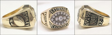Ten karat beauty from Jostens was presented to a college gridiron great.  Diamond-studded football on face, with "National Champions" surrounding in raised text.  "Ashley 54" on left shank; "Central State, NAIA, Marauders, 12-1" on right.  Initials "J.A." engraved inside band.