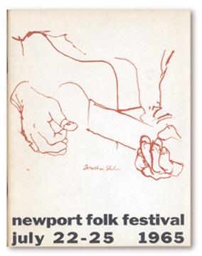 Incredible piece for what is undoubtedly Bob Dylan's most notorious performance. Dylan turned the folk world upside down by appearing on stage with electric instruments and a band. And although he was reportedly boo'ed off stage, from this moment on nothing would be the same. Program includes full festival schedule with Dylan, Donovan, Joan Baez, Peter Paul & Mary, Pete Seeger, Lightning Hopkins, Gordon Lightfoot and others as well as a story by Dylan Off The Top of My Head. Slightly aged o/w NRMT.
