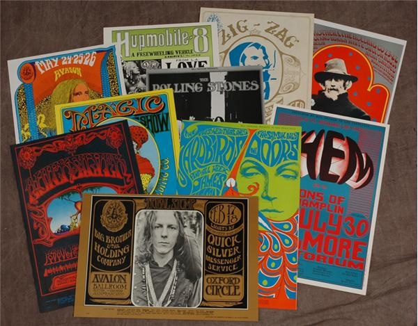 Vintage posters from rock’s psychedelic late ‘60s, featuring the likes of Janis Joplin & Big Brother, the Doors, Them, Steppenwolf, The Youngbloods, and -- on a marvelous and rare black & silver poster for a Nov. 9, 1960 Oakland Coliseum gig -- the Rolling Stones. Vivid, vibrant, full-sized (generally 14 x 20”) posters in the familiar swirling lines or comic book style, used and in some cases copyrighted by promoter Bill Graham for concerts mostly at the Fillmore and Avalon Ballroom. Features original artwork by pop culture artists of the era such as Wes Wilson, John Thompson and Family Dog Productions. All stunning, with the most unique a 10.5 x 24” poster for a Big Brother-Bo Diddley gig at the Avalon in the shape of a dollar bill, with the center image of an Indian and the legend: “May the Baby Jesus shut your mouth and open your eyes.” All posters VG-MT, with the Stones one pristine. A mixed bag of ‘60s rock. Break out a bottle of Yago and enjoy!!