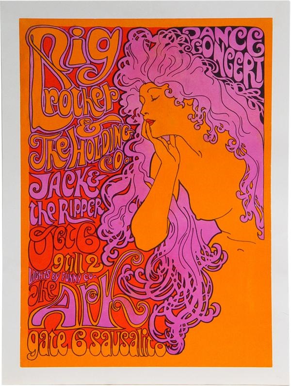 Gloriously groovy poster for an October 6, 1967 “dance concert” highlighted by Janis Joplin’s band Big Brother and the Holding Company at Sausalito’s The Ark, a favorite stop for the Bay Area’s legion of acid-rock bands. The poster, which showed up in stores and head shops, reflects the days of “bud and blotto” with a neon orange and purple rendering of a nubile nymph getting her groove on under a mass of swirling hair intermingling with the names of the bands, with Big Brother taking precedence on the upper left corner above Jack & The Ripper. At least 4 posters done in this style are known to exist for Joplin gigs at The Ark, and this may be the best. 16 x 21” and EX w/nearly invisible corner damage. Stand back a bit and it’ll look perfect, especially if you inhale. Mounted on linen with EXS-MT appearance.