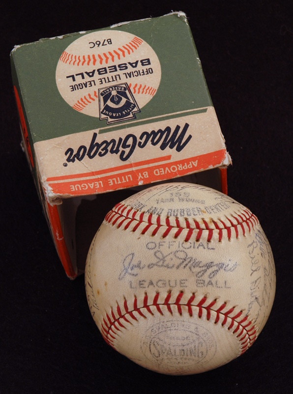 No better surviving piece of memorabilia exists from the Yankees’ historic and emotionally charged 1939 season than this incredible ball signed by 23 team members -- with the emotional centerpiece the immortal marker of Lou Gehrig smack on the sweet spot he had earned in a career, and life, that suddenly were interrupted by the diagnosis of a terminal illness early in the season. And this quality of excellence and continuity is also written on the ball, literally, in the signature on a side panel of Lou’s successor as team leader -- Joe DiMaggio, who had already reached a level of greatness such that the ball is stamped “Official Joe DiMaggio League Ball,” for Joe D’s amateur league, and willingly signed by his Yankee mates on that superb roster. Names include fellow HOFers Bill Dickey, Red Rolfe, Lefty Gomez, Red (as “Chas.”) Ruffing, Johnny Murphy, Frank Crosetti, Tom Henrich, Myril Hoag, Spud Chandler, Babe Dahlgren, Jake Powell, George Selkirk, Monte Pearson, Bill Knickerbocker, Bump Hadley, Steve Sundra, etc. Signatures are on the light side but eminently readable, averaging good 6’s and 7’s. Ball itself is toned to a delightful and classy light golden brown, and grades VG-EX status with a few brown specks including one just above -- but fortunately not encroaching on -- the very valuable Gehrig signature. Even comes in the original MacGregor box.