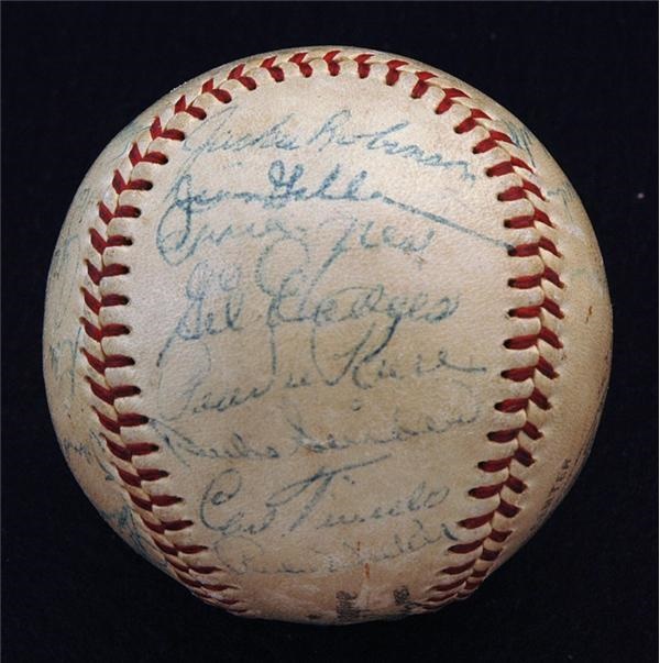 1) Harridge baseball from the late 1950’s, inscribed by The Splendid Splinter, “To Toni / your pal / Ted Williams”. Reach Official AL Ball, signed clearly and boldly in green ink. 2) 1955 or 1956 Brooklyn Dodgers, “The Boys of Summer”. Signatures of Hall of Famers Jackie Robinson, Roy Campanella, Sandy Koufax and 23 stellar teammates, Gil Hodges, Carl Furillo and many more, including Manager Walter Alston. Spalding Official NL ball. Signatures are sometimes light, and ball shows some game use. VGEX 3) 1956 NY Giants, green ink signatures of Willie Mays, Bill White, Dusty Rhodes, Hoyt Wilhelm and 21 teammates. Black ink signature of Manager Bill Rigney, in his last year with the Giants. Spalding Official NL ball. Condition VGEX. 4) 1957 Chicago White Sox, signatures of Hall-of-Famers Nellie Fox and Luis Aparicio, and 16 teammates in green and black ink. Ball printed “Chicago White Sox” in black ink .