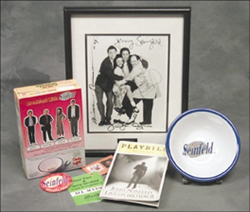 Great double-matted, framed 8x10" cast photo signed in black sharpie in 1997 by Jerry, Michael Richards, Julia Louis Dreyfus, and Jason Alexander. A Playbill from Jerry's "I'm Telling You For The Last Time" Broadway show, a granola cereal box with character cut-outs, "Seinfeld" logo cereal bowl, and Vegas backstage laminate and buttons round out this very Jerry lot!