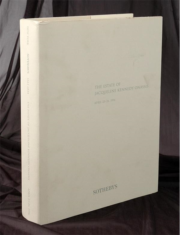 Jacqueline Kennedy Onassis Auction Catalogue, from the famous Sotheby’s auction, April 23-26, 1996. Precise annotation, lavish presentation and beautiful photography distinguish this Special HC Edition oversize catalogue of Jackie O’s furniture, books, paintings, personal effects and memorabilia. All nine sessions are included. hc, 12 x 9 1/2”, 584pp. A prices realized folder is included. Strong binding and overall excellent condition for both book and dust jacket. The cream/buff dust jacket exhibits some light smudging.