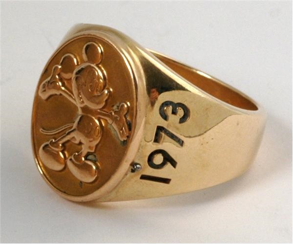 M-I-C-K-E-Y M-O-U-S-E.  Presented to early employee of Disney for his work on the groundbreaking Epcot (Walt Disney World).  10-karat gold ring has an image of Mickey engraved on the front. One shank has “1973” while the other has the Disney symbol. On the inside is an engraved “Disney” along with a copyright. Size 10.  NRMT.