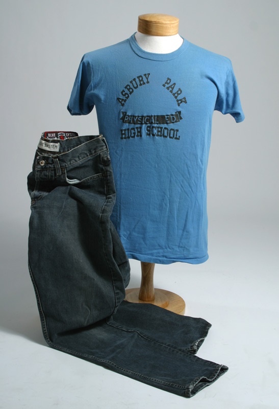 Dress for success. Dress like the Boss, as in Springsteen. This T-shirt and pair of jeans were worn by Bruce in the ‘80s. Might have been in Asbury Park. We’re not certain. The sizes of the pieces show him pre-bulked and with the thinness of youth. The Russell Athletic size large shirt that reads “Asbury Park High School Physical Ed” is in EX condition which seems appropriate because it is dedicated to physical education. Even though he attended Freehold High School with Bruce it’s all about Asbury Park. The navy blue jeans are Blue System size 31. They are Italian made, and therefore not Born in the USA. Jeans are EX also.