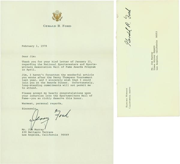 Three great letters, two handwritten and very rare, from ex-President Gerald Ford to famed sports columnist Jim Murray, on personal stationery with a gold presidential seal at the top center. In one of the handwritten notes Ford effuses: “I’m old enough to have read the best of Arthur Daley, Red Smith and Dave Anderson, but the Jim Murray work is at ‘the head of the class’,” adding, “Give me a call when you get to the desert. Betty joins me in wishing you the very best.” In another: “You are my all time favorite writer ‘across the board.’” Typed letter dated Feb. 1, 1978 respectfully declines Murray’s invitation to his induction into the Sportswriters Hall of Fame. All are signed, “Jerry Ford” in black/blue pen, NRMT signatures and letters. First two 6.25 x 8.5, 3rd is 7.25 x 10.5, light folds. Includes a note from Ford’s assistant concerning a letter that had been returned and 3 original mailing envelopes with Ford’s facsimile signature and Rancho Mirage address.