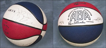 The last ever ABA World Championship. Spectacular red, white and blue Official ABA ball is signed by Commissioner Dave DeBusschere. Ball is an official team ball as well with "N.Y. Net" imprinted in the opposite side. Signed by the six key signatures on white panels in vintage marker: huge flowing Super John Williamson, Brian Taylor, Bill Melchionni, Swen Nater, Tim Bassett, and "Julius 'Dr. J.' Erving" in rare full signature. Ball is NRMT, sigs are excellent. The ABA's swan song from when it was a game.