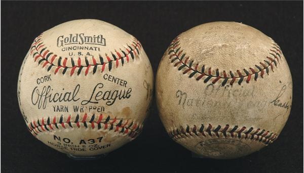 Lot of two autographed baseballs. First one: “Official League Cork Center Yarn Wrapped” stamped on the ball with 22 signatures. Also has stamps “GoldSmith Cincinnati U.S.A.” and No. A37 9 Inch 5 Oz. Horse Hide Cover.” Signatures include Joe DiMaggio, Rabbit Maranville, Paul Dean, and Dizzy Trout. Second ball is a vintage single signed example of Cubs catcher Gabby Hartnett. Bold autograph on a panel of an Official National League stamp. Balls and signatures are in Excellent condition overall.