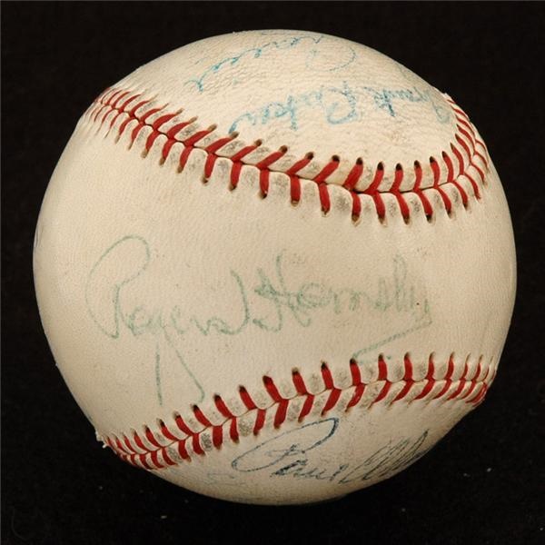 For all the profound signatures on its surface, this Hall of Fame Old Timers Ball from the ‘50s should be about as heavy as a shot-put. Just consider the names here. Start with Ty Cobb -- who was in the 1936 first class of inductees at Cooperstown -- who signed with his familiar line underscoring his name. Then move on to Rogers Hornsby, whose marker is as gruff and bold as the man was himself, taking over the sweet spot. Then marvel at the autographs of Lefty Grove, Paul Waner, Joe Cronin, Jimmie Foxx, Frank (Home Run) Baker, and Ray Schalk. Vintage signatures are in light blue ink (Waner in dark blue ink), and though they’re somewhat faded they all resonate with enough history to fill a textbook. Technically the grading averages 6/10 (Waner is the best at 7/10) but will display with incredible visxual appeal, more so since the OAL (Harridge) ball has remained impressively bright with light soiling visible only at close distance and overall is EX-MT, offering a nice contrast for the signatures of these 8 magnificent Hall of Fame legends.