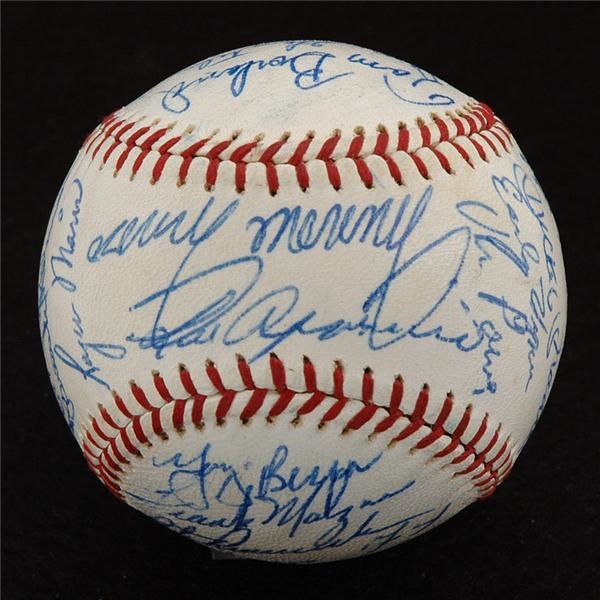 Outstanding ball signed by 30 members of the 1960 AL All-Star team represents a crossroads of history, the 3 whose signatures stand out above all the rest -- Ted Williams, for whom the 2 Midsummer Classics that year would be his last, and the dynamic duo of Mickey Mantle and Roger Maris, who would lead the Yankees to 5 straight pennants and of course take aim at Babe Ruth’s single season home run record the following year. Williams & Maris on one panel, Mantle on the opposite panel. Other notables include Early Wynn, Yogi Berra, Whitey Ford, Brooks Robinson, Nelson Fox, Al Kaline & manager Al Lopez (like Ted and Mick, all HOFers), Bill Skowron, Vic Power, Al Smith, Ronnie Hansen, Jim Gentile, Jim Lemon, Minnie Minoso, Harvey Kuenn, Frank Malzone, Bill Monbouquette, Jerry Staley, etc. Signatures are 7-8/10 beauties in vivid blue ink, while the ball is EX-MT and virtually spotless though the stampings have rubbed off.
