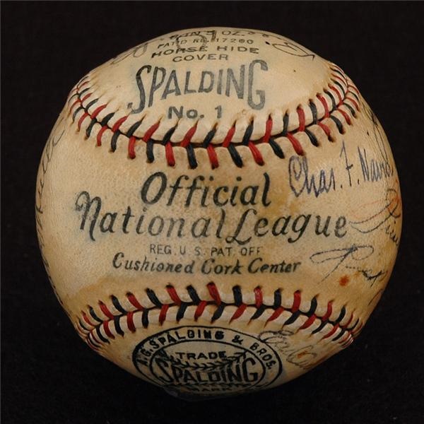 The All-Star Game made its debut on July 6, 1933, at Chicago’s Comiskey Park. It was initiated at the insistence of Arch Ward, a sports editor for the Chicago Tribune, to coincide with the celebration of the city’s “Century of Progress” Exposition. Official NL Baseball has been shellacked but remains in EX condition. Signatures are overall 8/10 with Lou Gehrig (9+) and Babe Ruth (8). Others include Dickey, Grove, Simmons, Lazzeri, Gehringer, Rommel, West, Averill, Dykes, Gomez, Foxx, R. Ferrell, Crowder, Cronin, Chapman, W. Ferrell, Hilderand, and owners Thomas Shibe and Clark Griffith. The single best All Star team baseball to have, this was not only the first ever All Star Game but also one of the best baseball teams to ever be assembled.