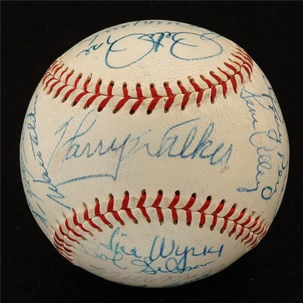 1967 National League All Star team signed ball with Roberto Clemente here. 23 of the senior circuit’s best on a spotless Giles NL ball. The Pirates star’s autograph is very large on a side panel. Also sports Hank Aaron, Tom Seaver, Lou Brock, Pete Rose, Bill Mazeroski, Fergie Jenkins, Ernie Banks, Bob Gibson, Joe Torre, Tony Perez, Walt Alston, Don Drysdale. Willie Mays and Juan Marichal are clubhouse examples. Team ball has been graded NRMT+ 7.5 by PSA/DNA.