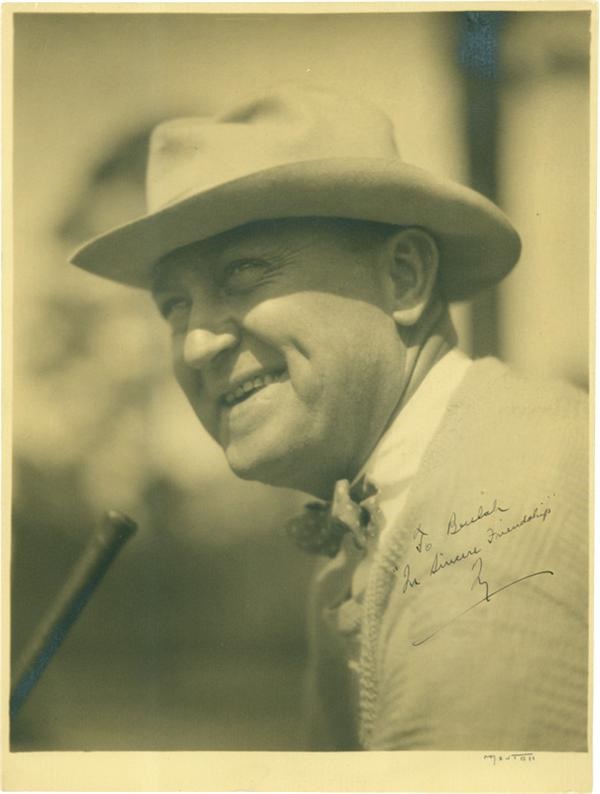 Ty Cobb, a giant in life, is captured in this 9 1/2 x 12 5/8” oversized signed photo. With an uncharacteristic smile and gaze directed away from the camera, this B&W photo of the baseball legend, well-dressed in fedora, bow tie, and sweater, with golf club in hand, is truly classic. The authentic inscription to the right of the image reads, “To Beulah - ‘In Sincere Friendship’ - Ty”. In pencil on the lower right, cream-colored border is “Montell”. There are tiny creases along the upper border that do not take away from the near mint photo of the smiling Ty Cobb. The blank back of the photo is clean as well. LOA.