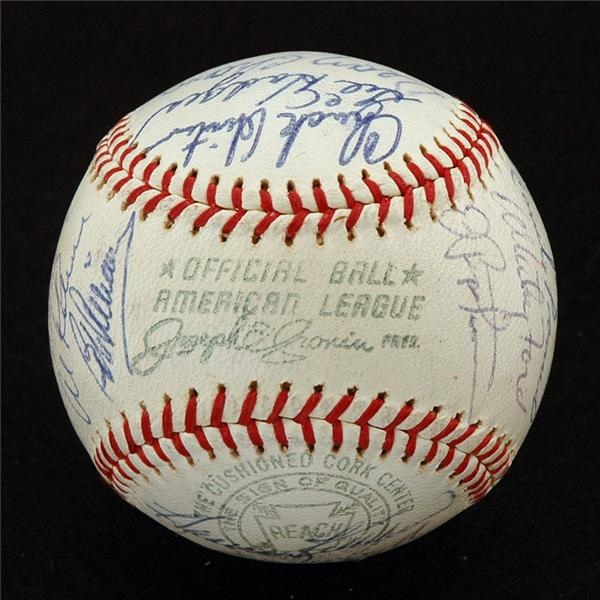 The only ball more valuable than this one just might be the one slammed by Johnny Callison into the Shea Stadium seats in the bottom of the 9th to win the ‘64 All-Star Game for the NL. Then again, given the names on this glowing OAL (Cronin) orb, it’s a close call. Ball contains signatures from 28 ALers, including some all-time cream of the crop -- HOFers Mickey Mantle, Whitey Ford, Al Kaline, Harmon Killebrew, Brooks Robinson and Louis Aparicio, as well as Elston Howard, Joe Pepitone, Gil Hodges, Rocky Colavito, Tony Oliva, Dick Radatz, Frank Malzone, Jim Fregosi and Dean Chance. Manager Al Lopez’ auto on the sweet spot is a clubhouse example. Signatures average 7-8/10, some better. Ball itself is rated PSA 8 (NM-MT) -- a gorgeous and rare All-Star ball recalling only one of two walkoff All-Star homer (the other of course being Ted Williams in ‘41). A real beaut, too, with hardly a scratch on it.