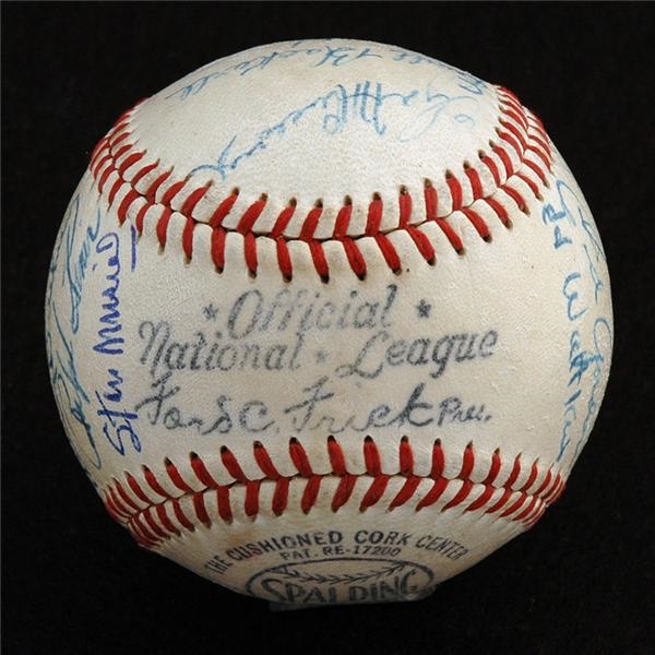 This ball has been signed by the 1948 NL All-Star team and is an Official NL Frick ball by Spalding. Clean signatures average 9/10, while the baseball is EX-MT+. Leo Durocher on the sweet spot, Johnny Mize, Enos Slaughter, Bobby Thomson, Ralph Kiner, Pee Wee Reese, Stan Musial, Ed Waikus, Richie Ashburn et al.