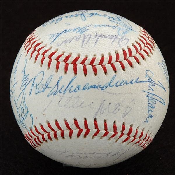This ball signed by the 1969 All-Star team is an Official NL Giles ball with 25 signatures. On its own stand and display case, the signatures average 7-8/10 while the ball is NRMT. Large Roberto Clemente on a side panel. Steve Carlton, Ron Santo, Tony Perez, Tom Seaver, Red Schoendienst, Willie Mays, Johnny Bench, Juan Marichal, Willie McCovey, Pete Rose, Bob Gibson, Jerry Koosman, et al. Hank Aaron is a clubhouse autograph. LOA.