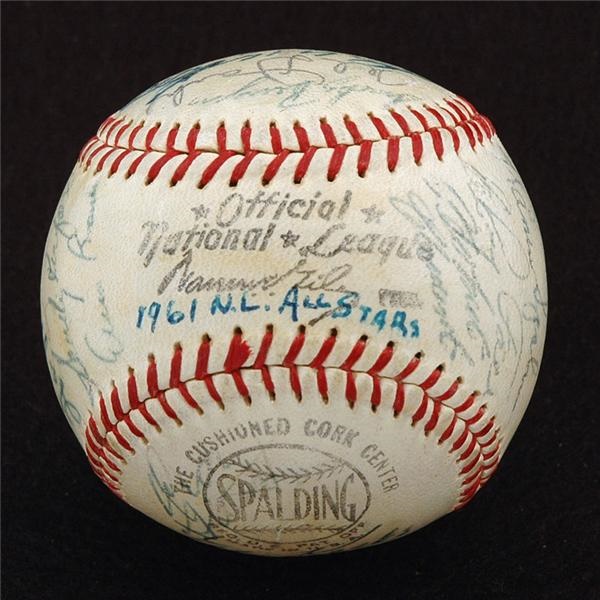 1961 was truly special. Two All-Star Games, one held in Candlestick Park and the other in Fenway Park, featured some of the game’s greats in their prime. Game 2 was a tie. Game 1 ended in the 10th inning with the NL walking with a 5-4 victory thanks to Hank Aaron, Willie Mays, and Roberto Clemente. Their signatures, averaging between 7 and 10, adorn this EX+ official NL ball from the Giles era along with 27 other all-stars including: Don Drysdale, Stan Musial, Sandy Koufax, Ernie Banks, Warren Spahn, Ed Mathews, Ken Boyer, Orlando Cepeda, Danny Murtaugh. Willie Mays and Al Dark are stamped examples.