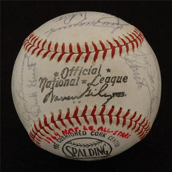 What a night at Shea Stadium. More than 50,000 packed the stands to witness Don Drysdale and Dean Chance square off in the 1964 All-Star Game. The National League won 7-4 in a summer classic with MVP Johnny Callision providing a ninth inning homer in a dramatic come-from-behind victory. This official NL ball is EX-MT with an astounding collection of the Senior Circuit’s finest with 28 signatures in blue and black pen averaging between 7 and 10. Feast your eyes on Roberto Clemente, Walt Alston, Fred Hutchinson, Ken Boyer, Curt Flood, Juan Marichal, Bill Mazeroski, Don Drysdale, Hank Aaron, Billy Williams, Jim Bunning, Ron Santo, Joe Torre, Willie Stargell, and Sandy Koufax. Casey Stengel and Willie Mays are clubhouse signatures.